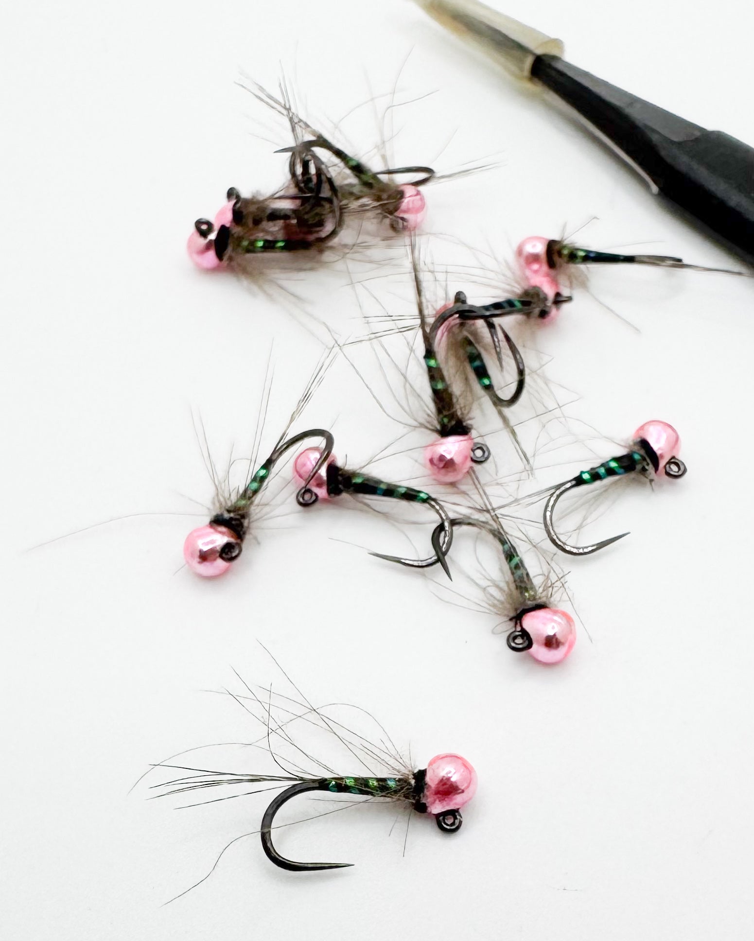 The Black Tide Baetis is a pattern based on a fly originally tied by Zach Vandehey. I tweaked it to my liking, and after a few refinements and hundreds of drifts now has a mainstay in my box. This bug has just the right amount of flash without overwhelming the pattern and the micro tinsel also creates a nice ribbing effect. The inverted pink bead makes the fly ride hook point up keeping it from hanging up on the bottom and adds a subtle trigger point. The inverted bead also keeps the hook point more exposed than traditional beads for better hook engagement. Last but not least is the cdc hackle collar that adds a bunch of movement to this fly fish can’t resist. When some baetis nymphs are ready to emerge their wing pads darken to a black color. I believe this pattern represents this very well and is something fish seem to key in on from time to time. Fishes great both dead drifted and swung as an emerger.