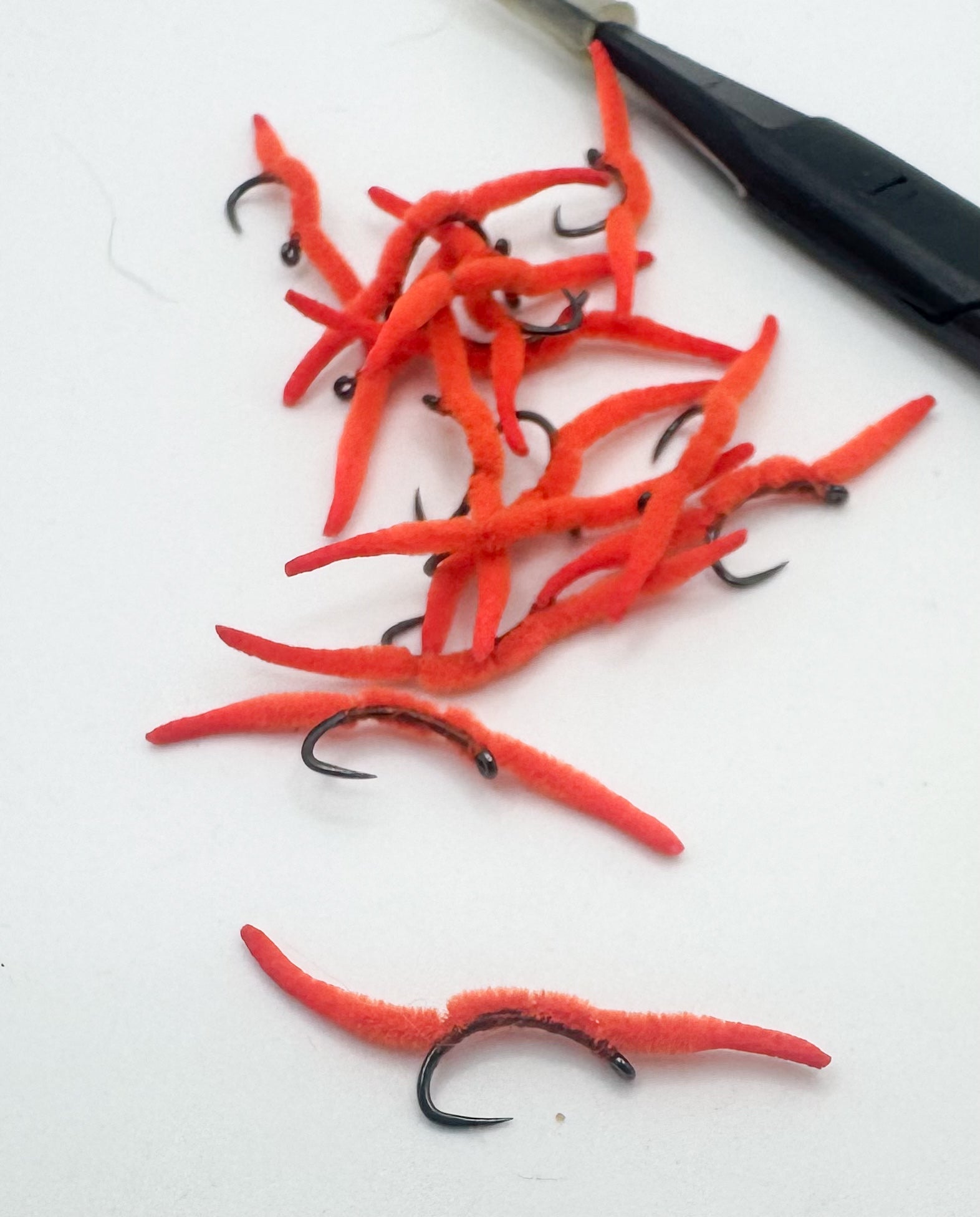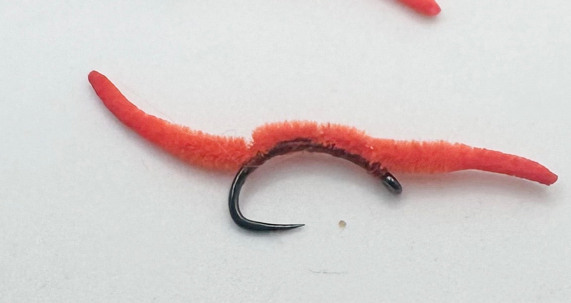 These micro worms are tied on a size 20 barbless scud hook.