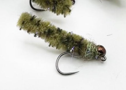 The Olive Mop Fly is an excellent imitation for insect larvae such as dragonfly nymphs, stoneflies, and small baitfish.